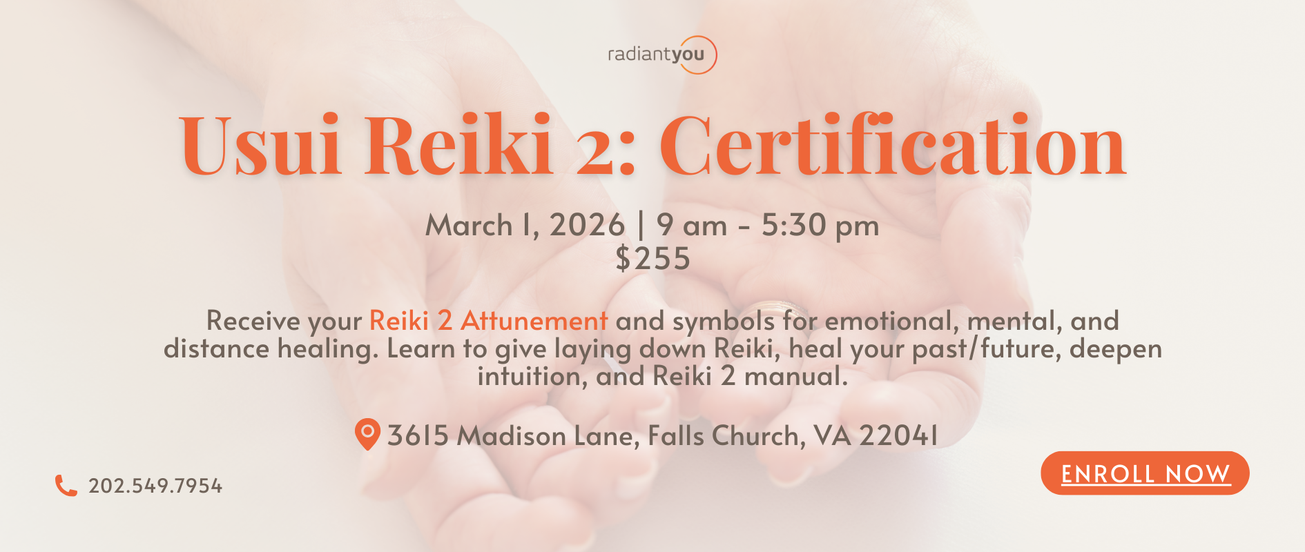 Double your Reiki power with Reiki 2. Learn to heal family and friends. Two new symbols brings healing of emotions and mental challenges and activates you to do long-distance healing and heal beyond time—including past and future.